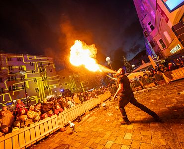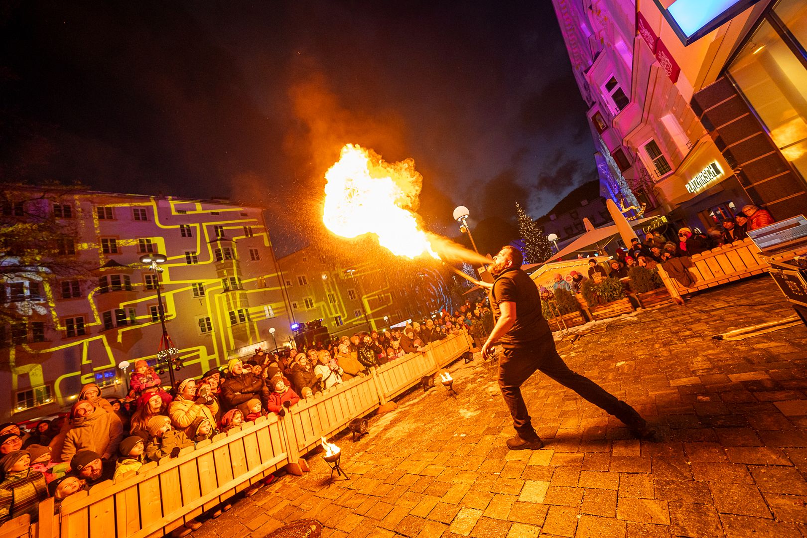Pressebild 1 – Spektakuläre Feuershows faszinieren die Besucher:innen am Unteren Stadtplatz, © TVB Kufsteinerland / Dominik Zwerger