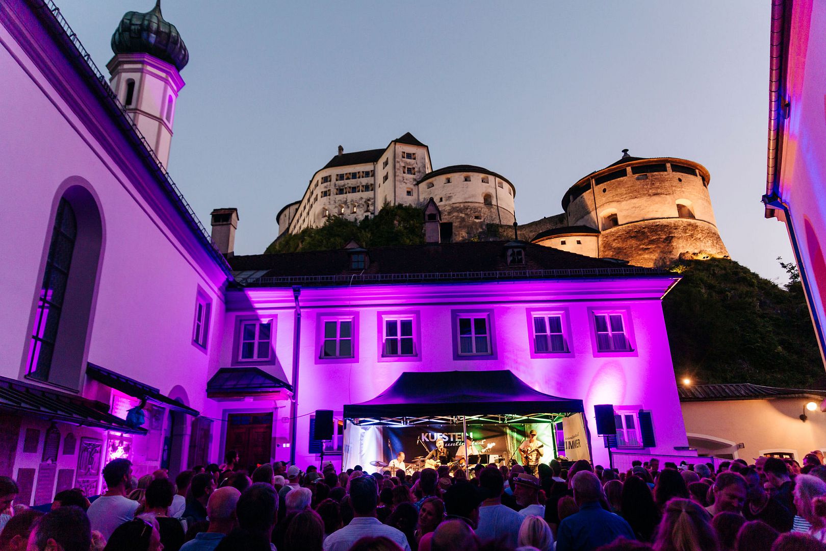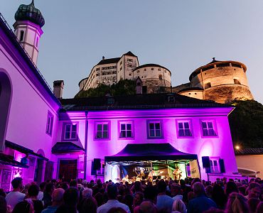 Foto 3: Ein besonderes Ambiente: Die Wohnzimmerbühne von KUFSTEIN unlimited mit Blick auf die beleuchtete Festung Kufstein gibt es seit 2025. ©Carina Pilz