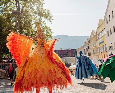 Abseits der großen Bühnen bietet KUFSTEIN unlimited auch heuer wieder ein abwechslungsreiches Programm für Familien und Liebhaber:innen der Straßenkunst. Wenn Farben lebendig werden, Papageien flirten und Bäume plötzlich zurück umarmen, dann sind die fantasievollen Walking-Acts nicht weit: Mit Colors verwandeln prachtvoll kostümierte Figuren das Veranstaltungsgelände in ein wirbelndes Farbenmeer. Die stolzen Pappagalli begeistern mit imposantem Federkleid und charmant-frechem Temperament. Für staunende Momente sorgen die Living Trees, die als lebende Bäume durch die Stadt laufen. Humorvoll wird es mit drei liebenswerten Köchen, die mit Witz und Charme für beste Stimmung im Publikum sorgen.
