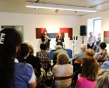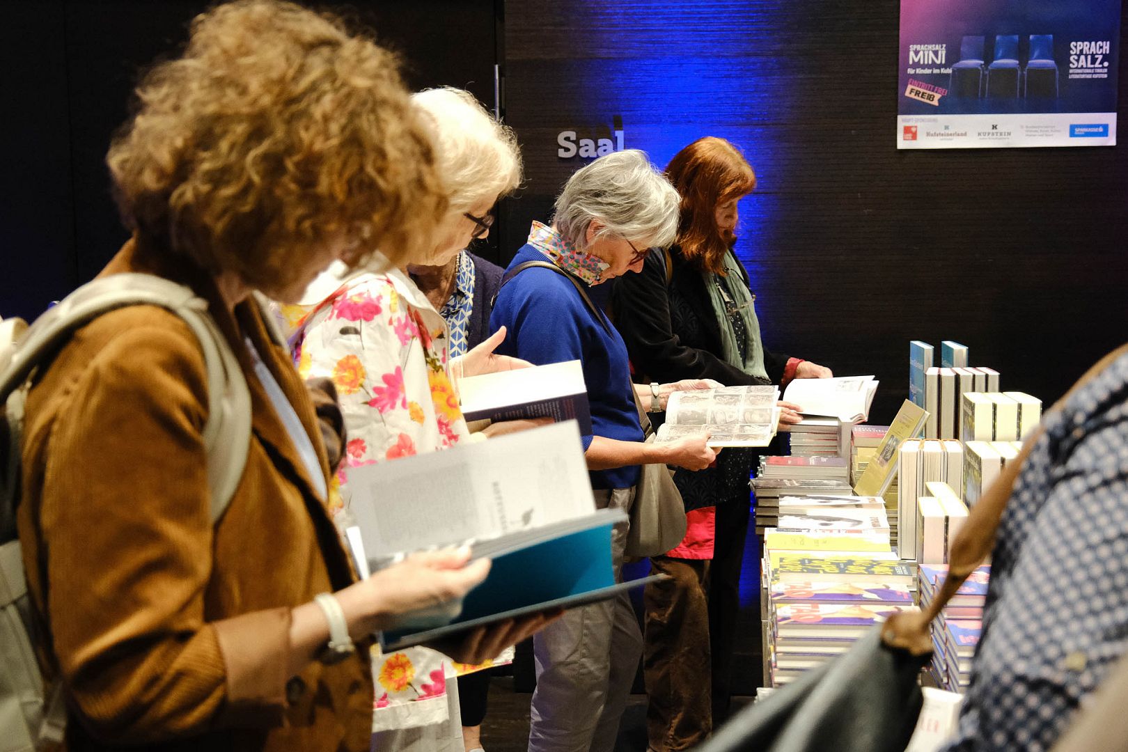 Traditionell eröffnete am Freitag eine Tiroler Autorin das Festival. In ihrem Gedichtband «Das zweite Gesicht» tritt Erika Wimmer Mazohl mit niemand geringerem als Dante Alighieri in Dialog. Das große Interesse an der Arbeit von Wimmer Mazohl zeigte sich auch im sonntäglichen Clubgespräch in der Galerie dia:log, wo das Publikum gemeinsam mit dem SPRACHSALZ-Team jede noch verfügbare Sitzgelegenheit hinauf in den ersten Stock zum Lesetisch trug.
