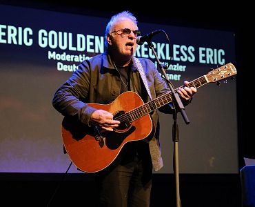 Der späte Freitagabend stand ganz im Zeichen der Musik. Als der Musikjournalist, langjährige SPRACHSALZ-Mitarbeiter und in London lebende Autor Hanspeter Düsi Künzler seine Hommage an sein Stadtviertel Kilburn vorstellte, stimmte der Folgegast Eric Goulden aka Wreckless Eric gleich mit einem Lied auf der Gitarre ein. Für die Lesung von Wreckless Eric nahm Künzler wieder seine gewohnte Rolle als Interviewer ein – ein dankbarer Job für das 71-jährige Energiebündel. Szenen aus der Lesung: Goulden, der mit seinem breiten Cockney-Akzent die Vorzüge der heuer erstmals eingesetzten Dolmetsch-KI aufzählte und sie dabei an ihre Grenzen brachte. Nach und nach verwob sich die Stimme von Ernst Gossner, der meisterhaft den Text auf Deutsch vortrug, mit der akustischen Version von Wreckless Erics Hit «Whole Wide World». Dass der 1974 geschriebene Song im letzten Jahr seinen 50. Geburtstag feierte, wurde Goulden erst beim großen Gala-Abend bewusst. Eine verpasste Chance, wie er selbst einräumte. Gut, dass am Samstagabend nachgefeiert wurde. Er brachte mit seiner Performance das Publikum zum Tanzen.