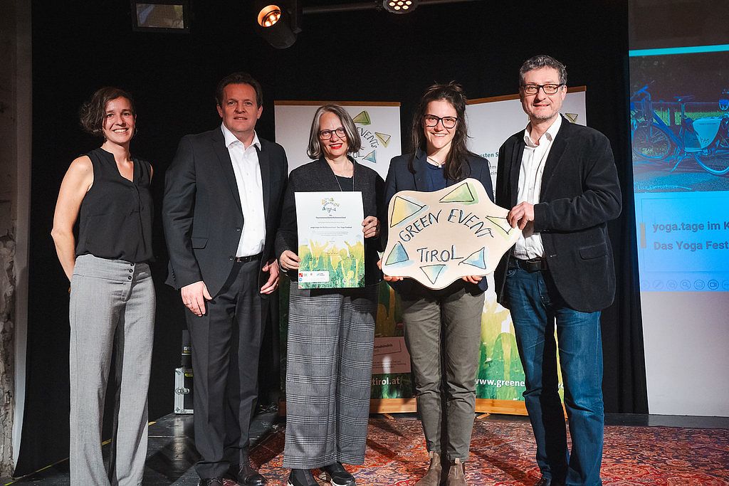 Für das erfolgreiche Event „yoga.tage im Kufsteinerland – das Yoga-Festival“ nahmen Geschäftsführerin Sabine Mair und TVB-Themenmanagerin Lina Schneeweiß von Landesrat René Zumtobel in Innsbruck die Green-Events-Tirol-Auszeichnung entgegen.